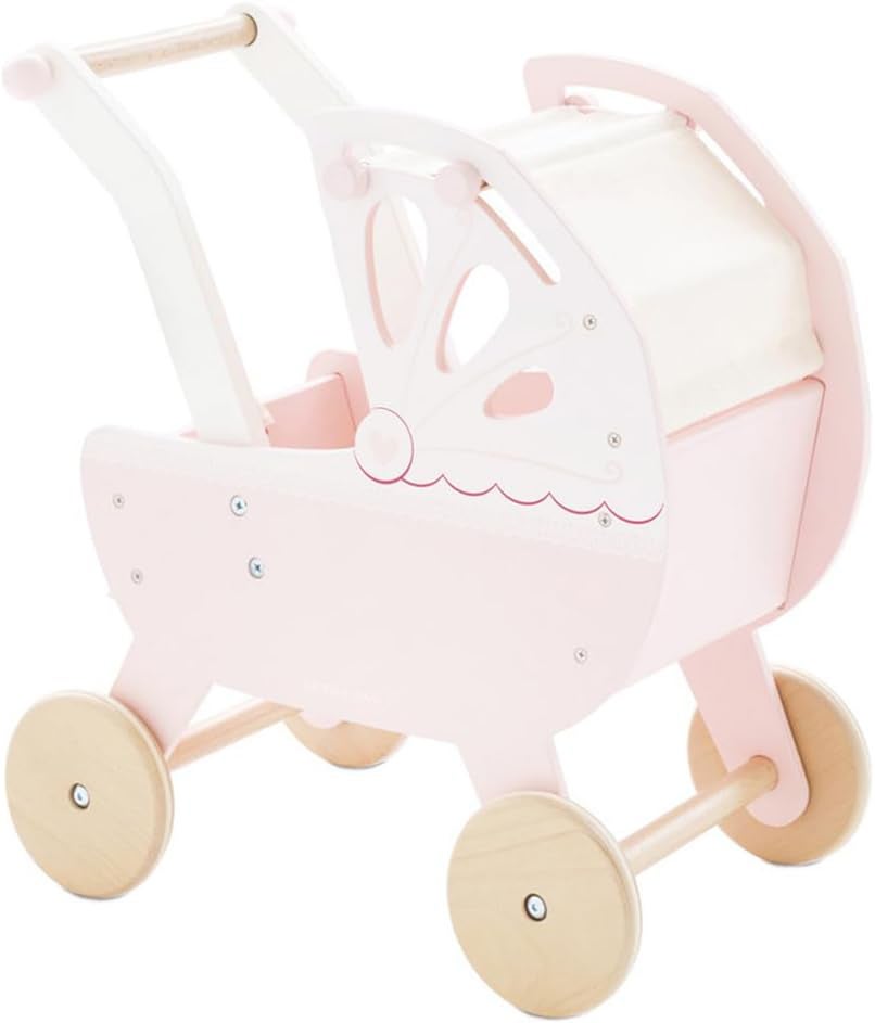 Dukkevogn i trę fra Le Toy Van med et stilfuldt design. Perfekt til mange timers sjov. - Barnevogn til dukker og bamser. - Perfekt til rolleleg. - Passer til dukker op til 38 cm. - Opmuntrer til både social og individuel leg. - Blųde, stųjsvage gummihjul der ikke ridser gulvet. - CE-męrket. - Anbefalet alder: Fra 3 år. - Trę, stof.