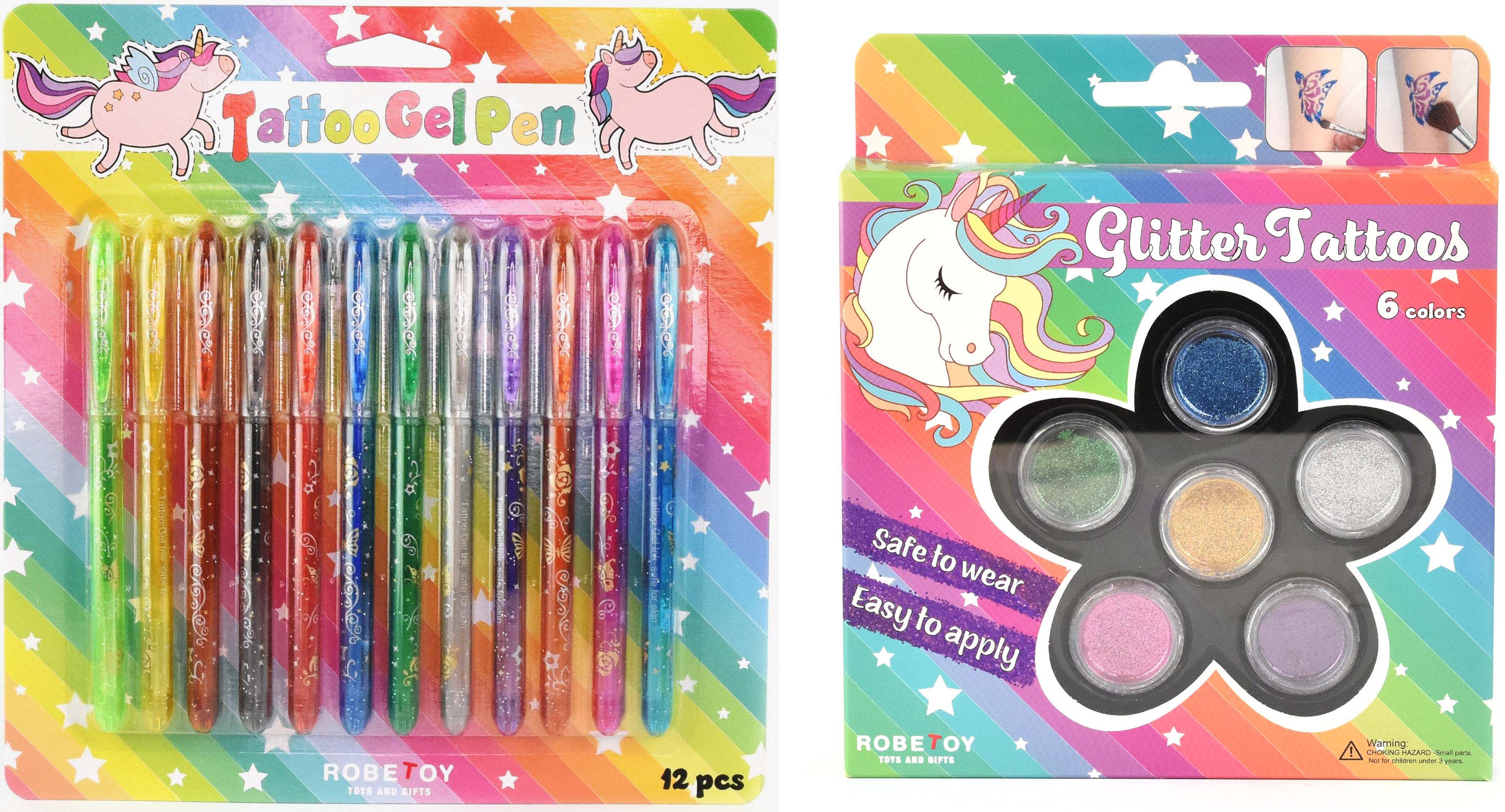 Tatoveringssæt fra Robetoy med skønne glimmerfarver og 12 glimmertatoveringspenne. Brug din fantasi og tegn direkte på huden. Tatoveringerne er lette at få væk med sæbe og vand. Anbefalet alder: Fra 3 år.