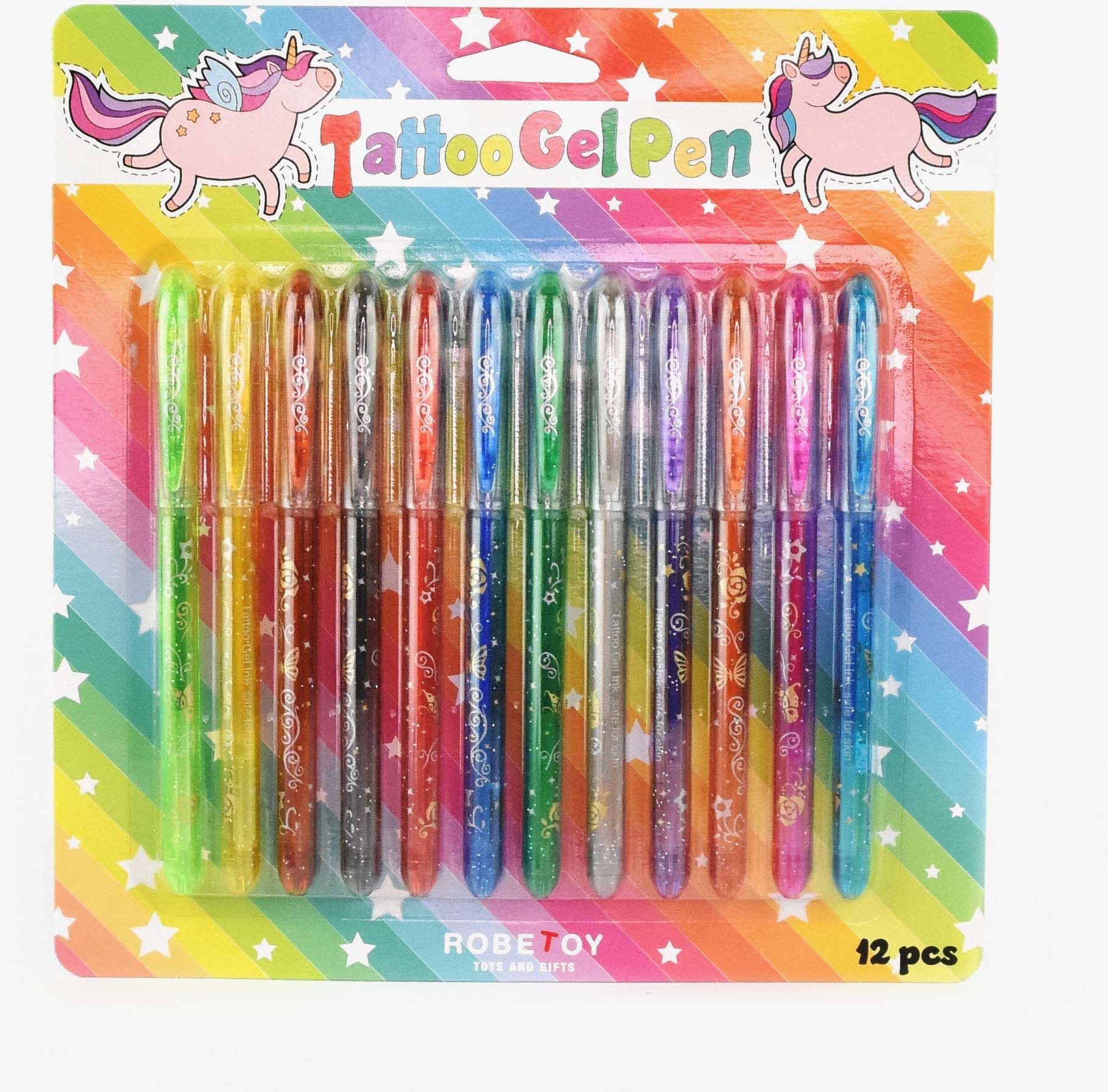 En pakke med 12 glitterpenne fra Robetoy. Lav dine egne personlige og farverige tatoveringer med disse glittertatoveringspenne i 12 forskellige farver. Brug din fantasi og tegn direkte på huden. Tatoveringerne er lette at vaske af med sæbe og vand.