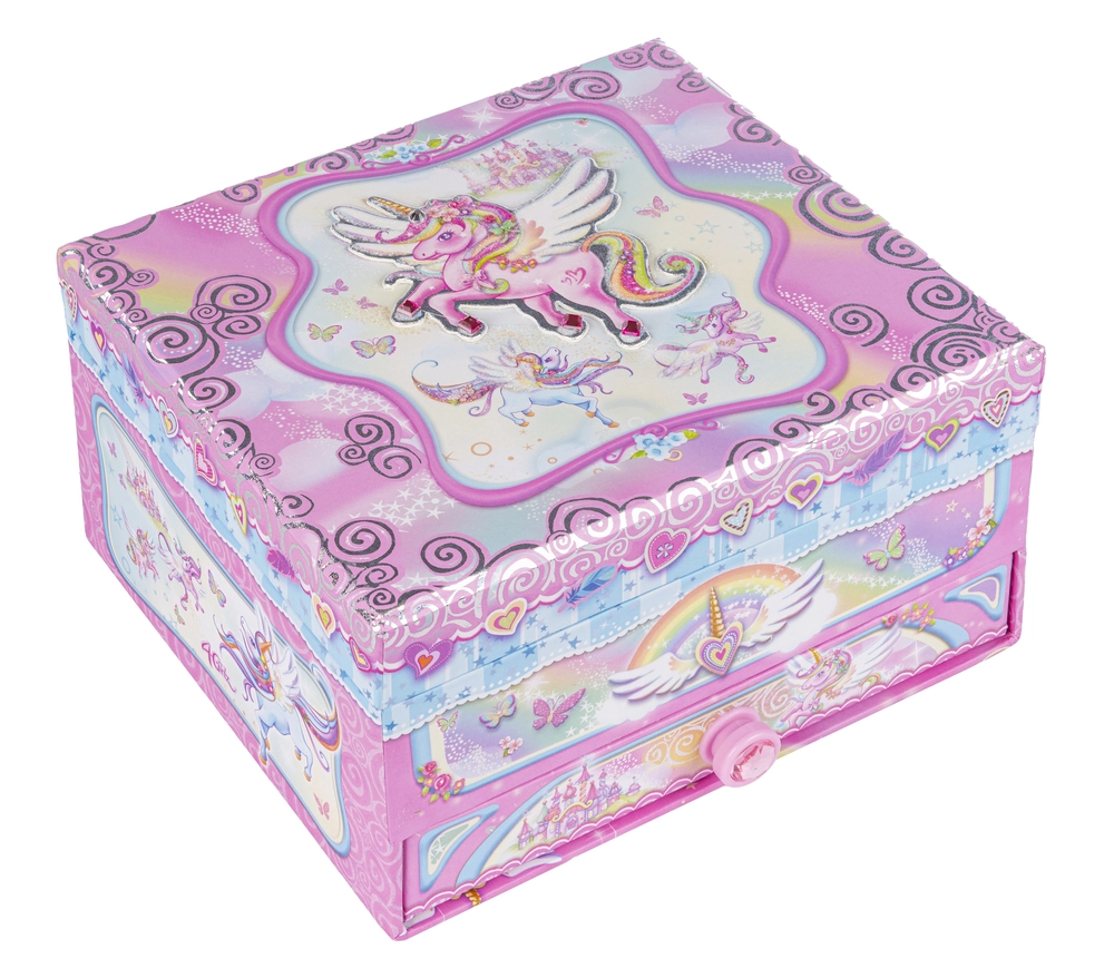 Smykkeskrin med skuffe Med optræksfunktion, bevægelig enhjørning, hjerteformet spejl og skuffe. Uden smykker.