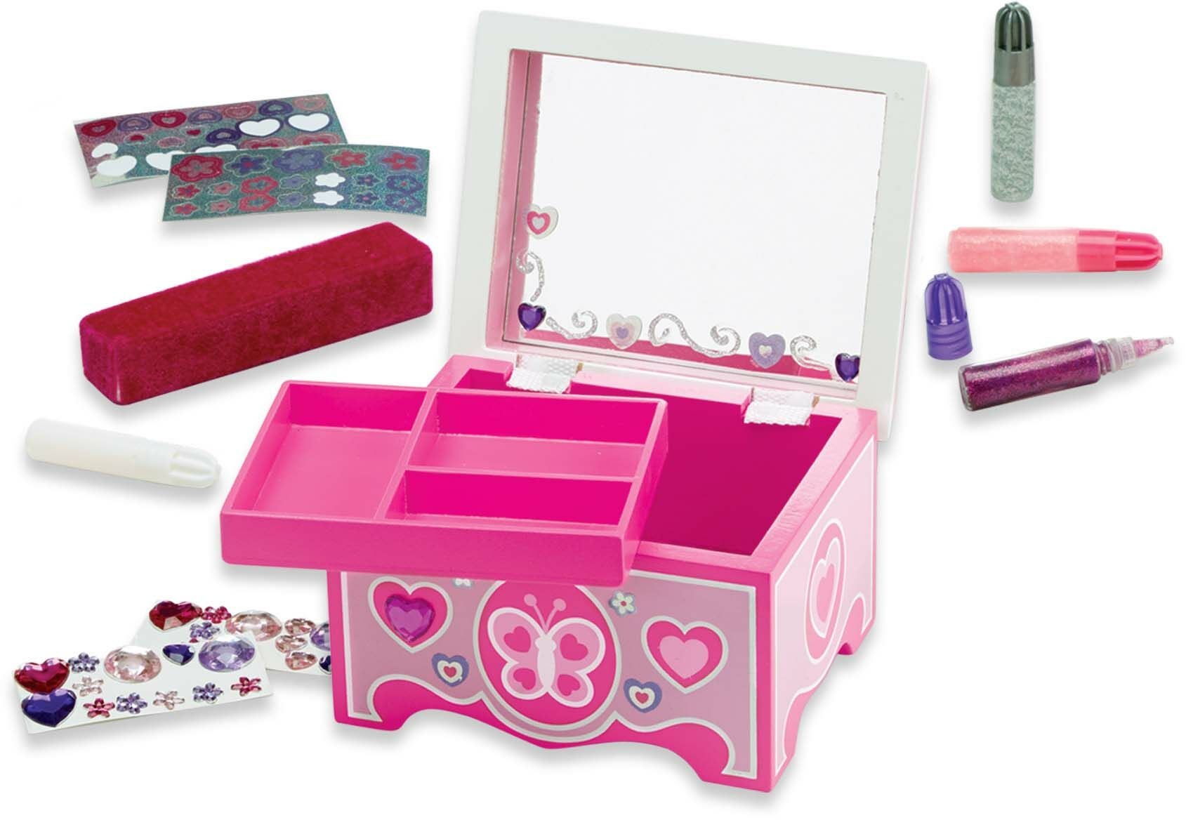 Smykkeskrin i træ, som du kan dekorere, fra Melissa & Doug. Giv smykkeskrinet dit personlige design med det medfølgende tilbehør. Skrinet har et spejl indvendigt og ringholder i fløjl. Sættet inkluderer glimtende diamanter, glitrende klistermærker og glimmerlim, så du kan dekorere skrinet præcis, som du vil have det. Anbefalet alder: Fra 4 år