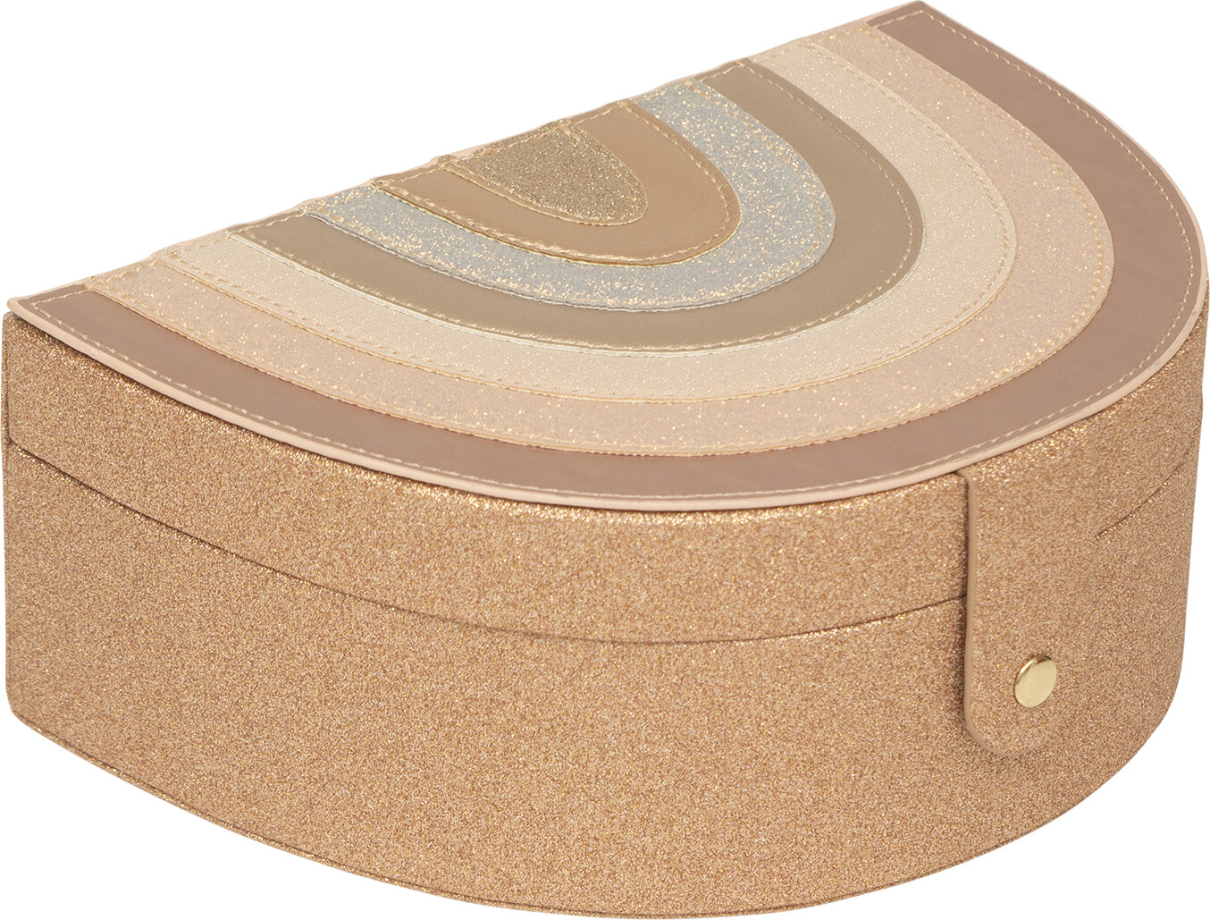 Halvmåneformet smykkeskrin i fine naturfarver med snaplås og en regnbuedekoration på låget....