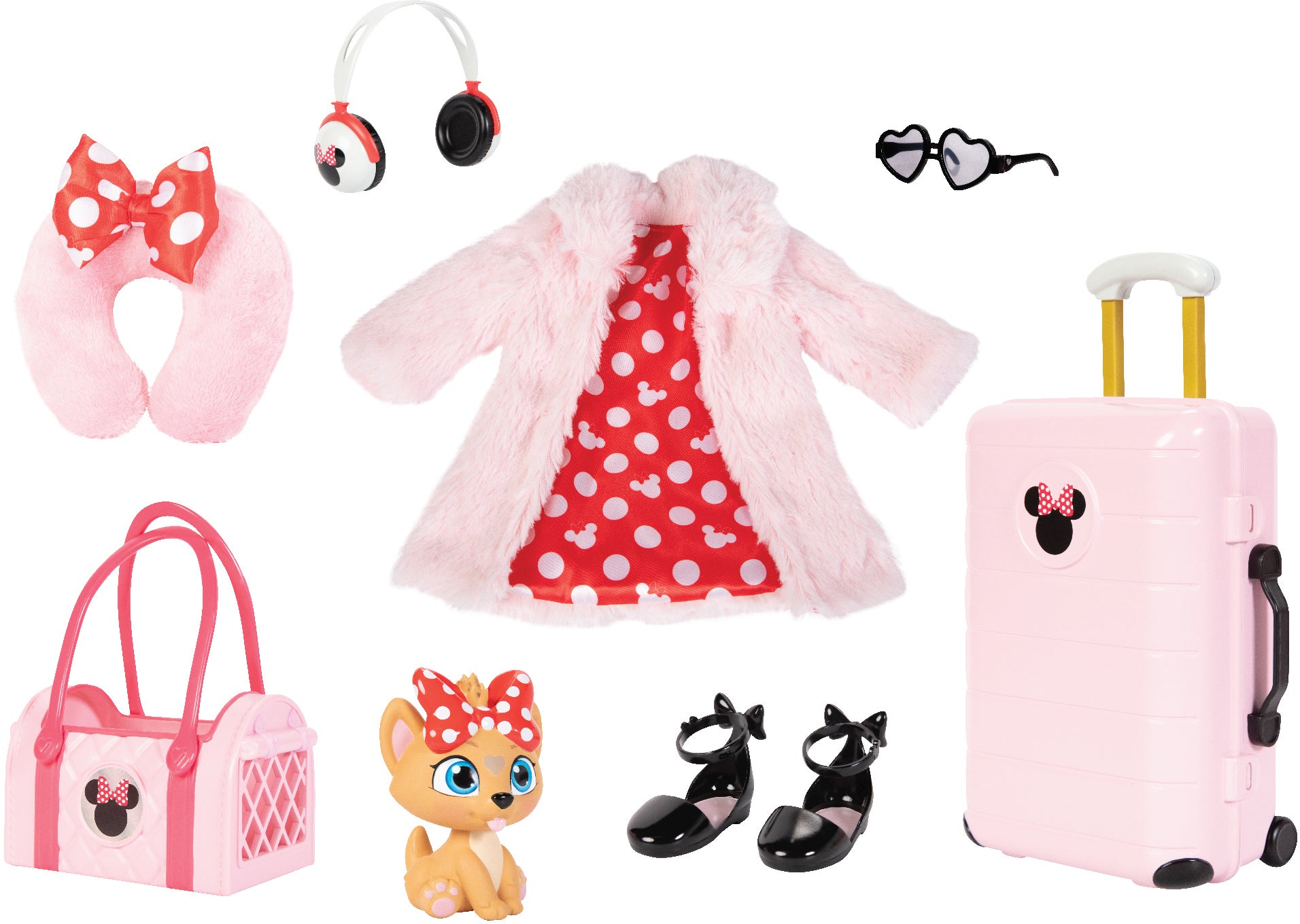 Tilbehørssæt fra Disney Minnie Mouse med passende tilbehør til dukkerne. Perfekt til timevis af fantasifuld leg. - Indeholder: 1 kuffert, 2 sko, 1 taske, 1 kæledyr, 1 frakke, 1 solbriller, 1 headset, 1 hovedpude. - Style din dukke! - Passer til de fleste dukker på 45 cm. - Underholder og stimulerer dit barn. - CE-mærket. - Anbefalet alder: Fra 6 år. - Plastik.