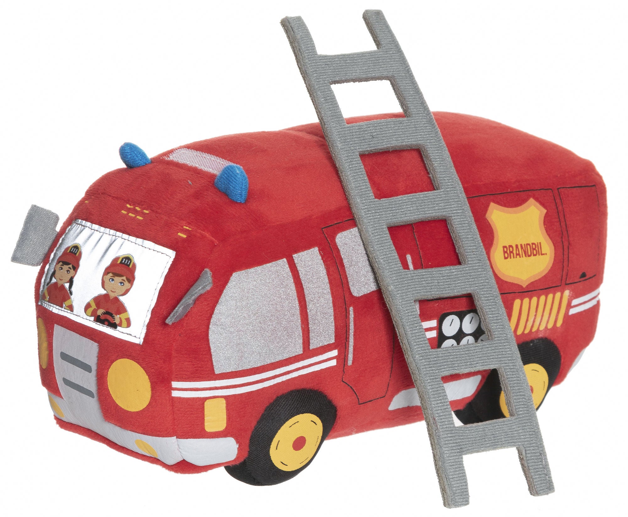Fin blød brandbil fra Teddykompagniet fremstillet af blød polyester. Brandbilen har en aftagelig stige, der sidder fast på taget med velcro. Brandbilen er en anderledes legekammerat, som dit barn kan lege med og tage med i seng, når det skal sove. Den kan vaskes i vaskemaskinen og har polstring fremstillet af PET-flasker. Anbefalet alder: Fra 0 måneder.