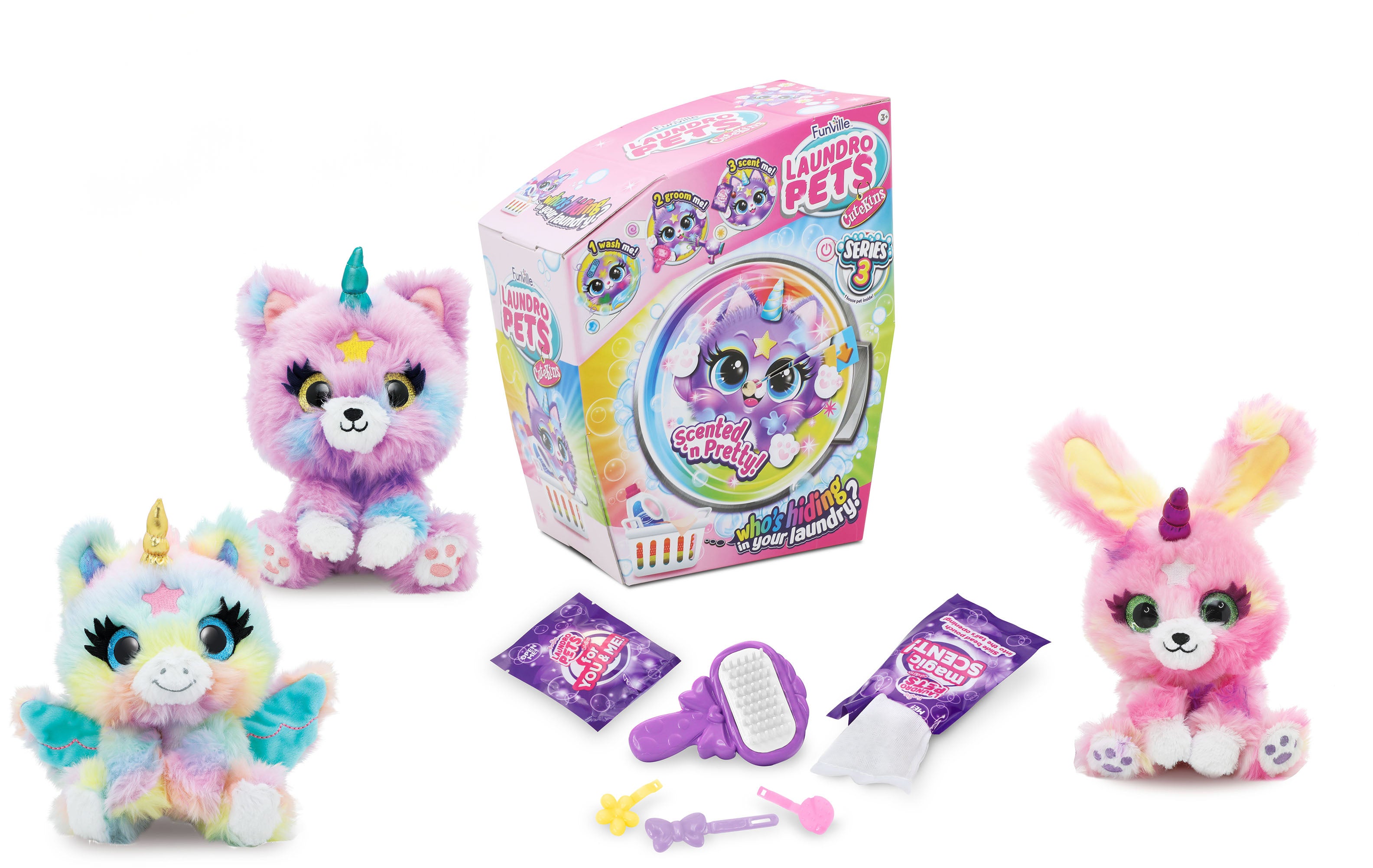 Cutekins Laundro Pets sæt fra ToyRock med tre kæledyr. Perfekt til mange timers sjov. - De søde tøjdyr skal først have et bad, derefter tørres og børstes for at få pelsen til at skinne. - Afslut spa-sessionen med at spraye tøjdyret med en dejlig duft. - CE-mærket. - Anbefalet alder: Fra 3 år.
