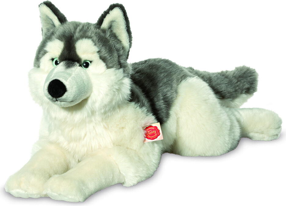Liggende husky hund. Vaskeanvisning: Kan maskinvaskes ved 30°C uldprogram. Tåler IKKE...