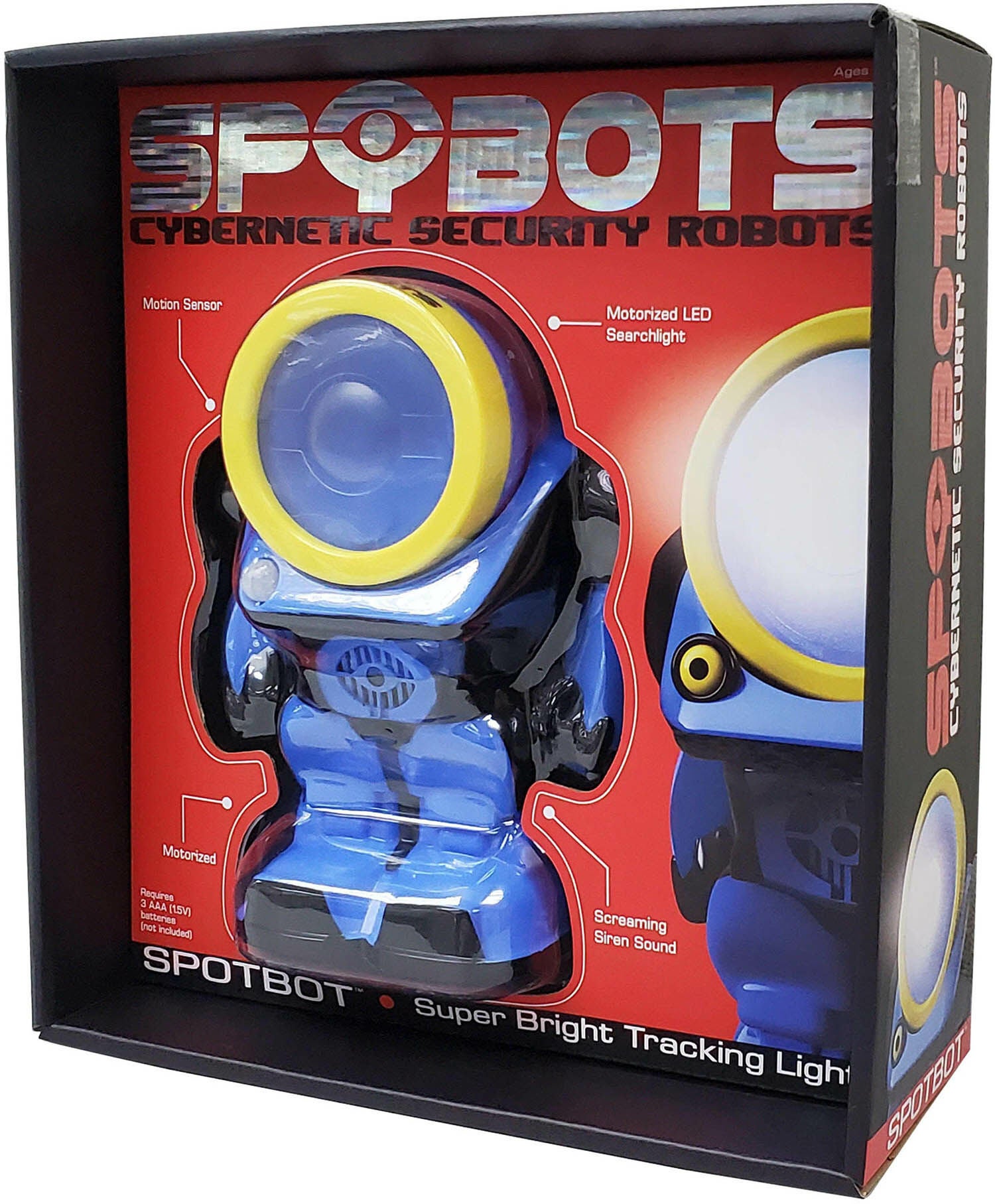 Interaktiv Spot Bot robot fra Spybots med en bevægelsessensor. Den har en højlydt sirene med blinkende lys, der vil advare dig, hvis en ubuden gæst krydser dens vej og hjul under dens fødder, så den kan jage den ubudne gæst væk. Gør dit værelse sikkert med Spot Bot! CE-mærket. Anbefalet alder: Fra 6 år. Batteri: 3xAAA (medfølger ikke). Batterier medfølger ikke.