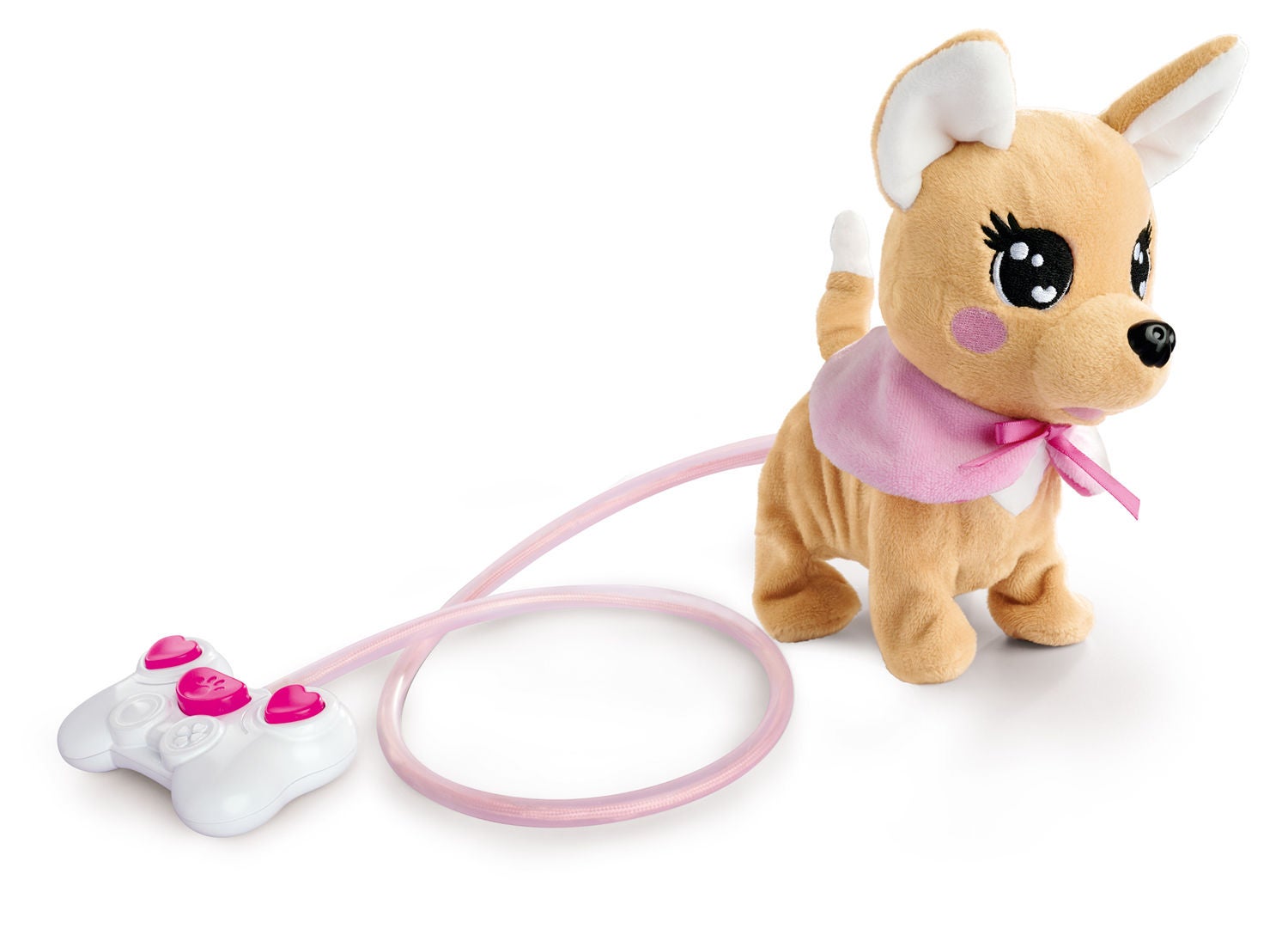 En sød fjernstyret hund fra ChiChi love med lydende snor og håndkontrol. Den søde hund kan udføre forskellige kommandoer, som at gå, gø og logre med halen. Du styrer alt med kontrollen, der er tilsluttet hunden via et kabel. Anbefalet alder: fra 3 år.