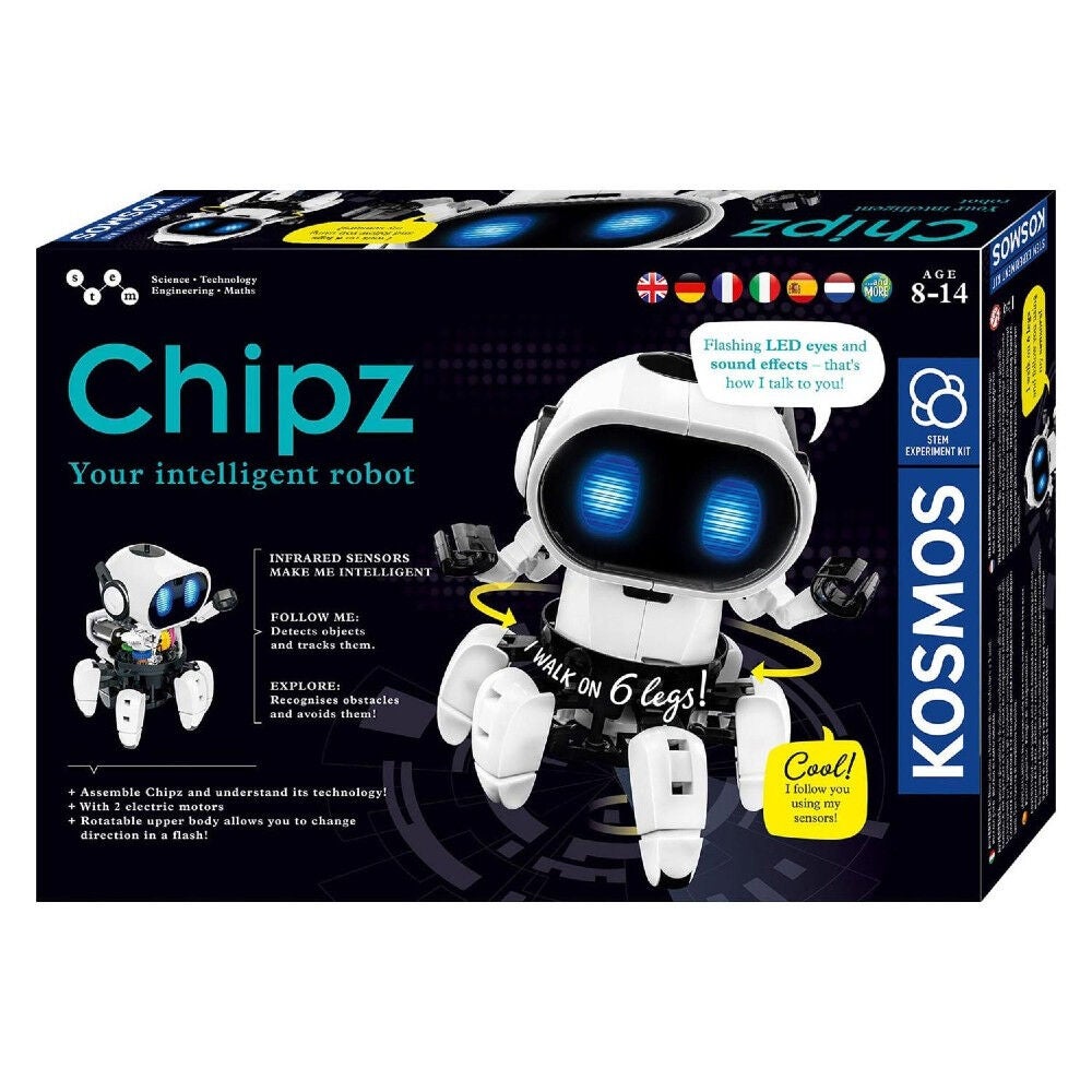 Interaktiv Chipz robot fra Kosmos med infrarøde sensorer. Den har oplyste øjne og lydeffekter. Robotten har seks ben, så den let kan gå i en hvilken som helst retning. Robotten kan programmeres til at gøre flere ting og er en spændende introduktion til teknologi og robotter. CE-mærket. Anbefalet alder: Fra 8 år. Batteri: 4 x AAA (medfølger ikke).
