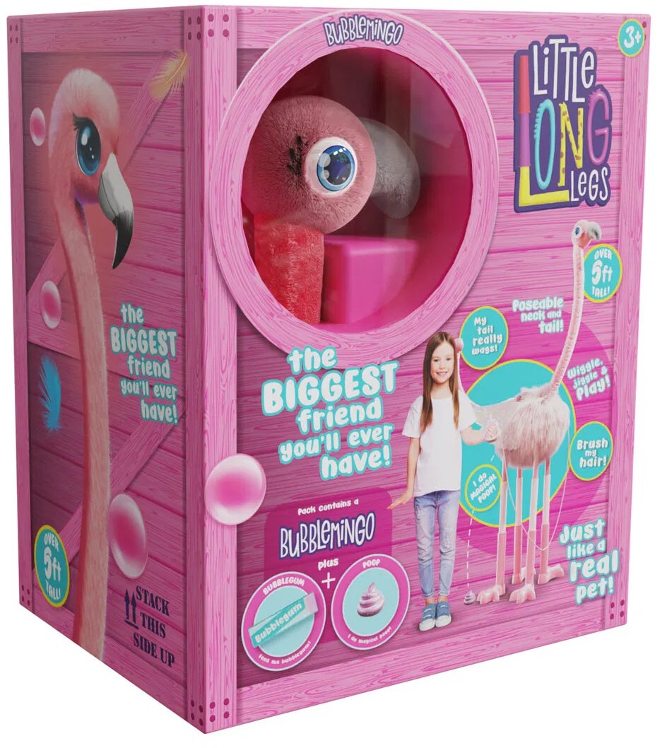 Stor flamingo fra Little Long Legs med sjove funktioner. Perfekt til timevis af fantasifuld leg. - Indeholder: 1 flamingo, 1 pakke med tyggegummi, 1 magisk bæ. - Elsker tyggegummi og laver magisk bæ. - Går, snakker, spiser og laver stort. - Bevægelig hals og hale. - Justerbare ben. - CE-mærket. - Anbefalet alder: Fra 3 år. - Batterier medfølger ikke.