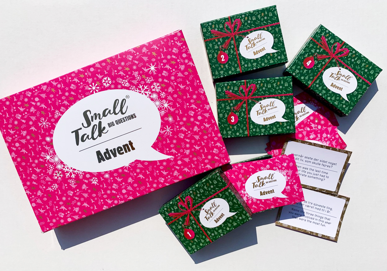 Bliv lidt klogere på hinanden, jer selv hver i sær og på verden med dette sjove og lettilgængelige kortspil med spørgsmål om alverdens ting og sager. Der findes 4 forskellige æsker i serien Small Talk - Big Questions. De 4 klassiske æsker har blandede spørgsmål i mange forskellige kategorier, som handler om ens personlige erfaring, perspektiv og følelser. Denne udgave er lavet for at give familien en særlig hyggestund i juletiden. Der er 4 pakker med 15 spørgsmål i hver, så der er nye spørgsmål til hver adventssøndag.Spørgsmålene er ikke årstidsafhængige og kan bruges når som helst på året. Det, vi super godt kan lide ved spillet, er, at der ikke er rigtige og forkerte svar, og at spørgsmålene står på både dansk og engelsk. Fx: Hvad stod der i den SMS, du sidst sendte?Hvordan tror du, at Verden ser ud om 100 år?Hvad er det første, du lægger mærke til, når du møder et nyt menneske?Hvad er din smukkeste blomst, du kender?Træk et kort og læs spørgsmålet op. Herefter kan I alle sammen svare på spørgsmålet. Måske var der noget, du ikke vidste om de andre!Fra 6 år. Her kan du læse mere om, hvordan en pakkekalender kan give mere ro i julemåneden