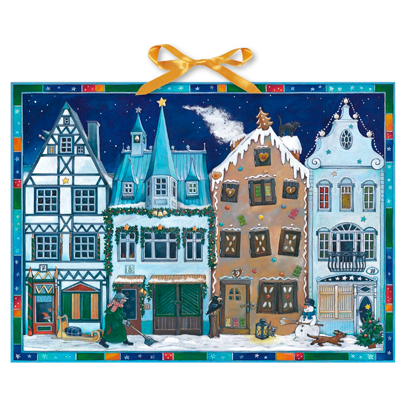 Stor og flot klassisk julekalender med 24 låger, hvor der under lågerne er billeder, der matcher det store billede af en glitrende snedækket gade en kold juleaften.Hvad gemmer der sig mon inde bag alle vinduerne?Billedet er illustreret af Maria Wissmann, som også har illustreret flere børnebøger.Med fint og praktisk bånd til ophæng.