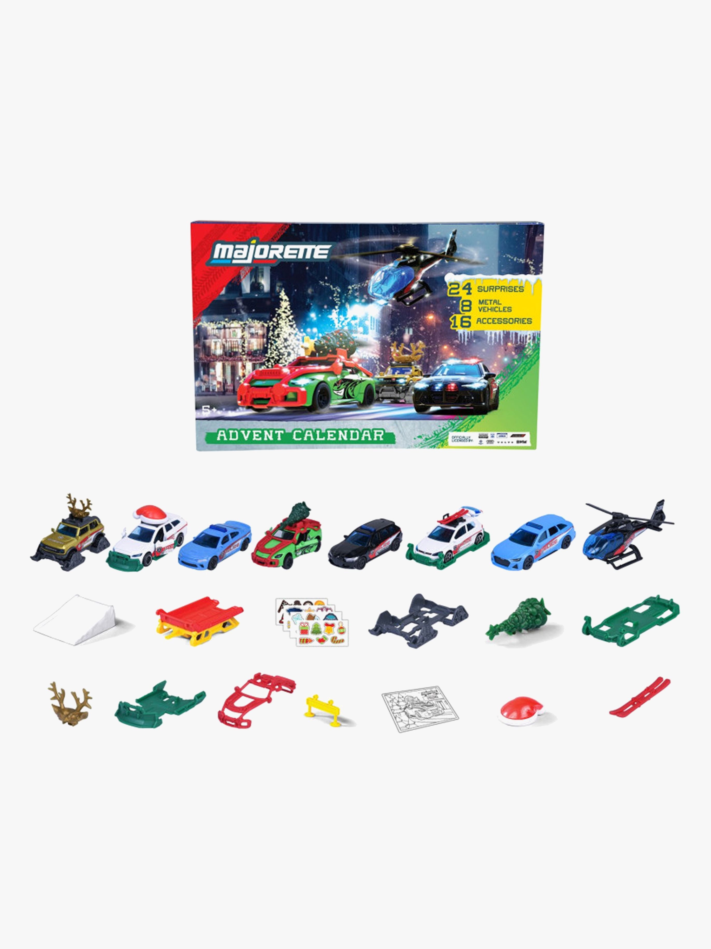 Julekalender fra Majorette med 24 spændende overraskelser. Den har otte eksklusive biler med en masse forskelligt tilbehør og medfølgende klistermærkeark. Start nedtællingen til juleaften! - Indeholder: 8 figurer, 12 tilbehør, 4 klistermærkeark. - Bilens længde: 7,5 cm. - Frihjul. - Dele, der kan åbnes. - 24 unikke overraskelser, der spreder glæde hver dag indtil juleaften. - CE-mærket. - Anbefalet alder: Fra 5 år. - Plastik, karton, metal.