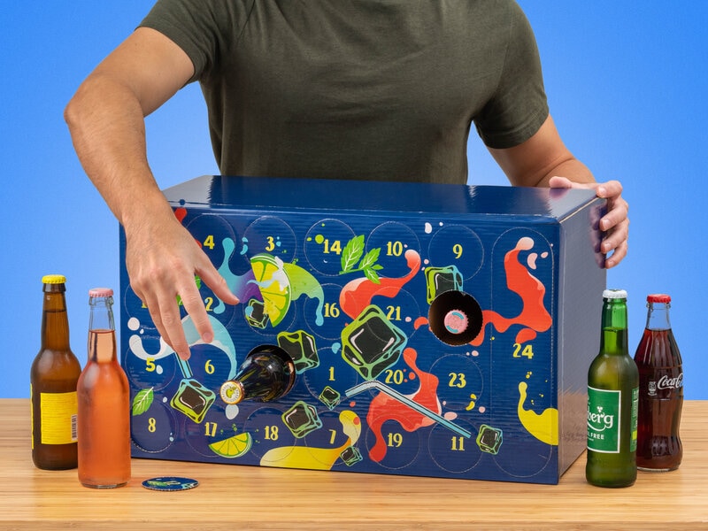 Forkæl en, som er tørstig, med en drikkevarekalender! Sodavand, cider eller måske hjemmelavet saft? Hvad du fylder kalenderens rum med, er helt op til dig - det kan man da kalde en personlig gave! Kalenderen rummer fireogtyve flasker, er fremstillet i pap og leveres sammenfoldet Bemærk at der ikke medfølger drikkevarer.