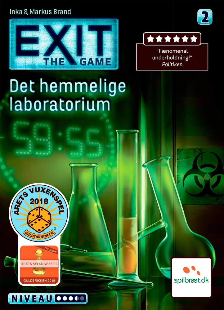 EXIT - Det Hemmelige Laboratorium er et samarbejdsspil, hvor en lang række gåder skal knækkes. Her er både sprog- og talgåder samt visuelle hovedbrud såvel som mysterier, der kræver, at alle samarbejder og tænker sig godt om. Spillerne dyster mod gåder