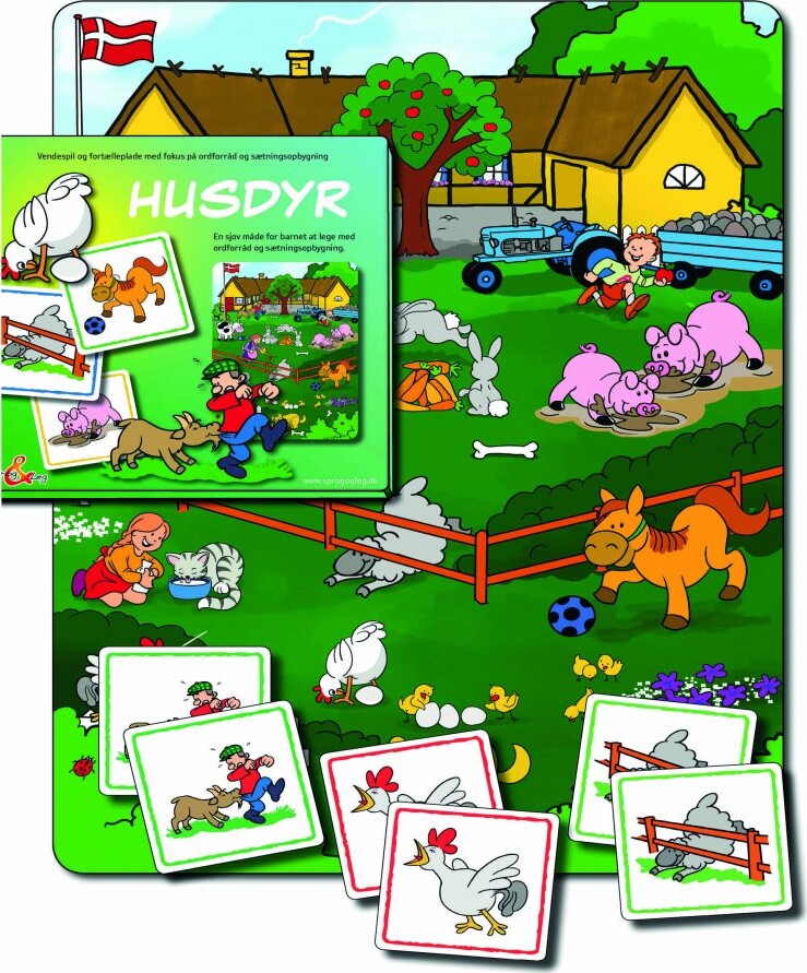 Med dette farverige vendespil og samtaleplade kan man arbejde med sætningsopbygning, tælleremse og udsagnsord. Brikkerne kan bruges som traditionelt vendespil. Indhold: 2 x 10 brikker Fortælleplade