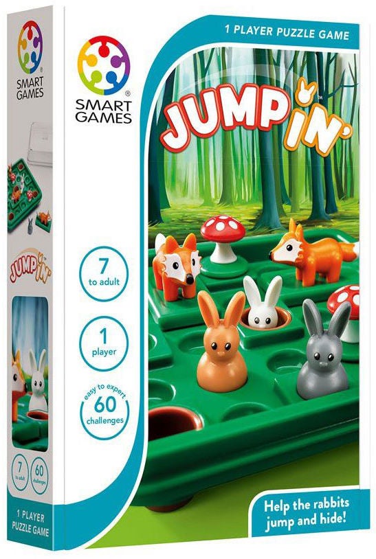 Jump In fra Smart Games er et sjovt spil, hvor du skal hjælpe de søde kaniner med at hoppe og gemme sig. 60 udfordringer med forskellige sværhedsgrader, der passer til hele familien. I Jump In lærer du at planlægge, tænke logisk og løse problemer. Bærbar spilleplade med låg, der er perfekt til at tage med på ferie. Anbefalet alder: Fra 7 år.