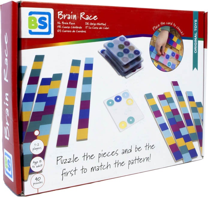 Brain Race brętspil fra BS Toys. Flyt strimlerne for at skabe det rigtige mųnster. Placer kortet over på strimlerne, for at se om du har gjort det rigtigt!. CE-męrket Anbefalet alder: Fra 6 til 12 år