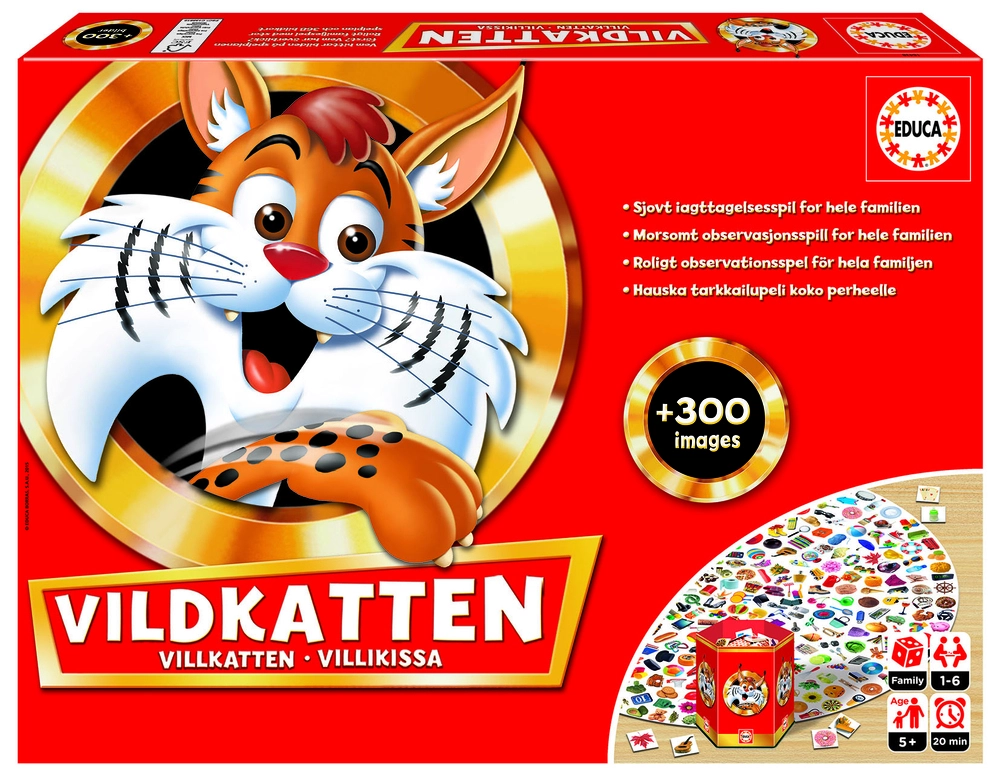 Vildkatten er et enormt populært brætspil for familiens yngste. Vildkatten er uhyre simpelt og måske netop derfor så vanedannende. I Vildkatten skal I egentlig bare finde motivet som matcher jeres kort. Nemt? Ikke når det unikke motiv gemmer sig blandt