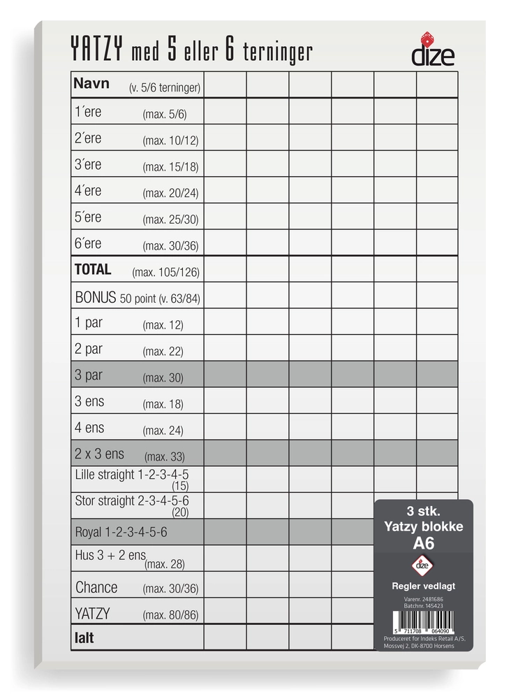 Gør dig klar til klassisk underholdning med Yatzy blok A6 3-pak, hvor du kan udfordre venner og familie i det velkendte terningspil. Med denne pakke får du tre blokke, hver med 50 sider, så der er rigeligt med spilleglæde til mange aftener. Vejledningen e