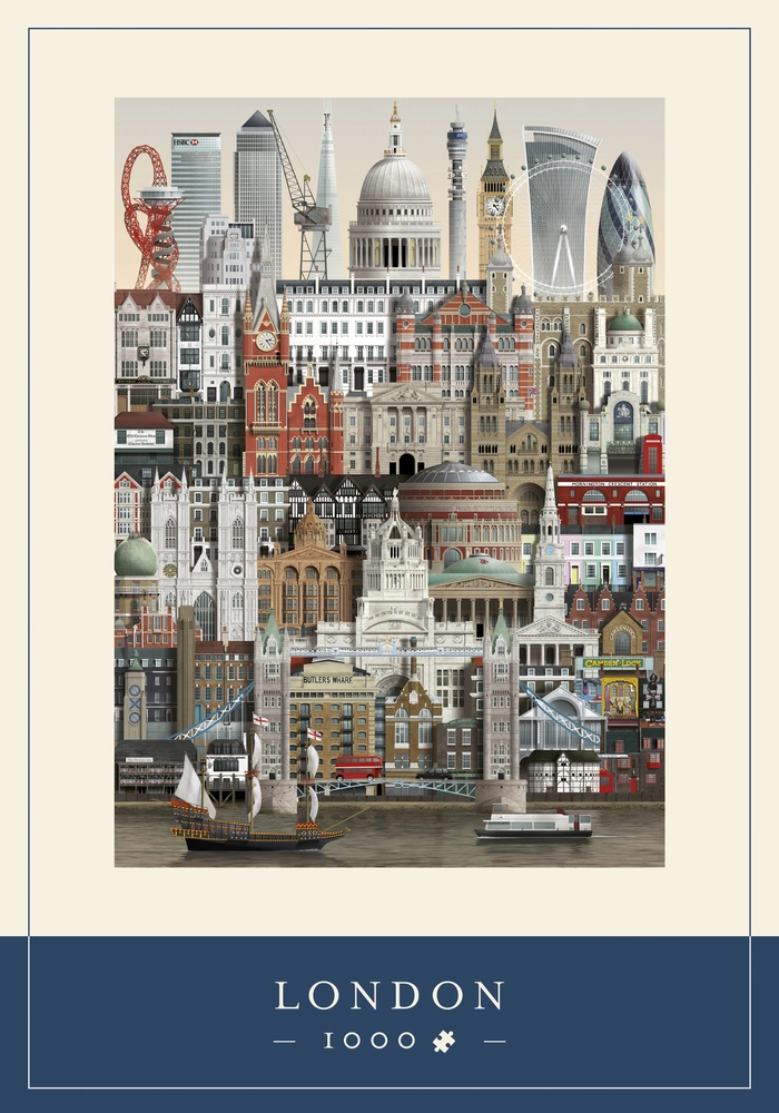 Samlede mål: 50 x 70 cm. Dyk ned i Londons pulserende byliv med dette detaljerige puslespil fra Martin Schwartz. Med 1000 brikker åbner der sig en verden af ikoniske bygninger og arkitektoniske vidundere, der tilsammen udgør sjælen af den britiske hove