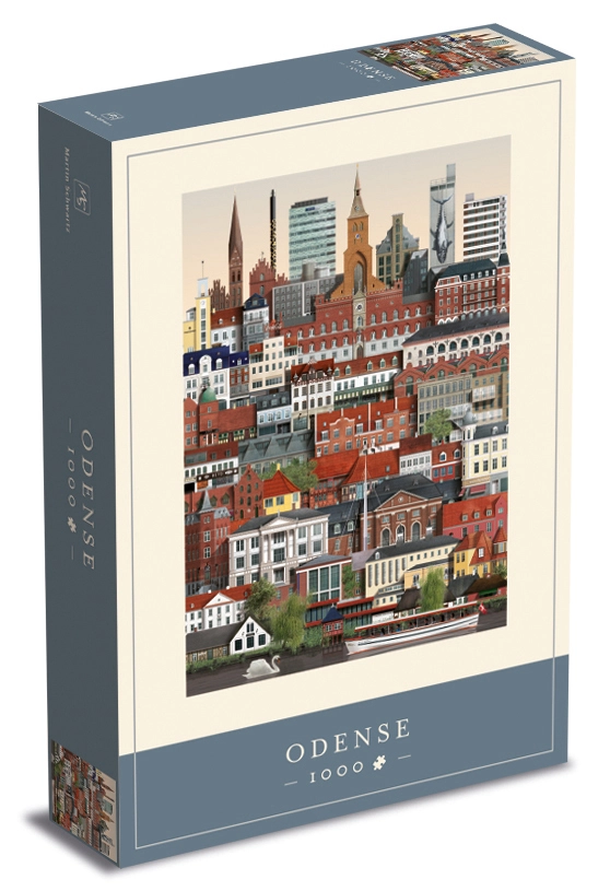 Samlede mål: 50 x 70 cm. Oplev Odenses charme og historie med et puslespil fra Martin Schwartz. Dette 1000-brikkers puslespil er en hyldest til byens ikoniske bygninger og den unikke atmosfære, som gør Odense til noget særligt. Mens du lægger hver brik