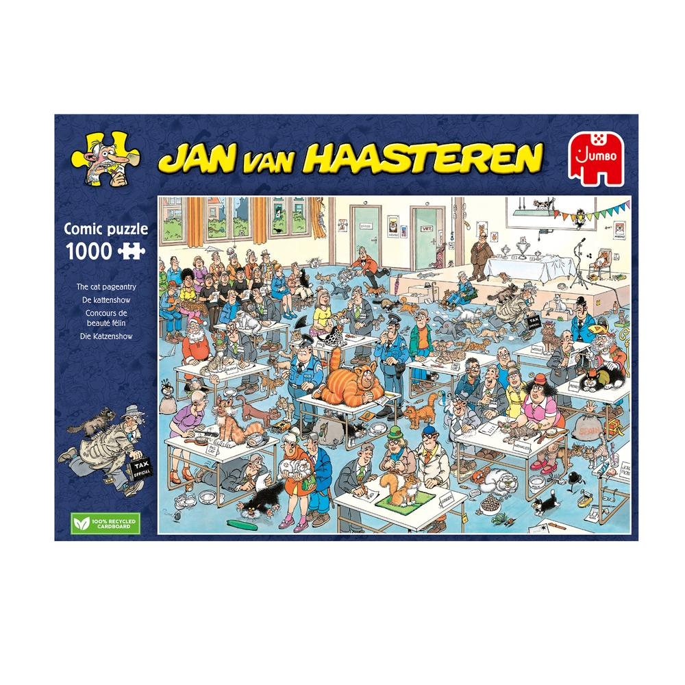 Puslespil med sjovt og detaljeret motiv. Jan Van Haasteren er kendt for at skabe billeder, hvor øjnene virkelig kan gå på opdagelse i et væld af humoristiske scenarier og detaljer - puslespillet her er ingen undtagelse. Måler 68 x 49 cm