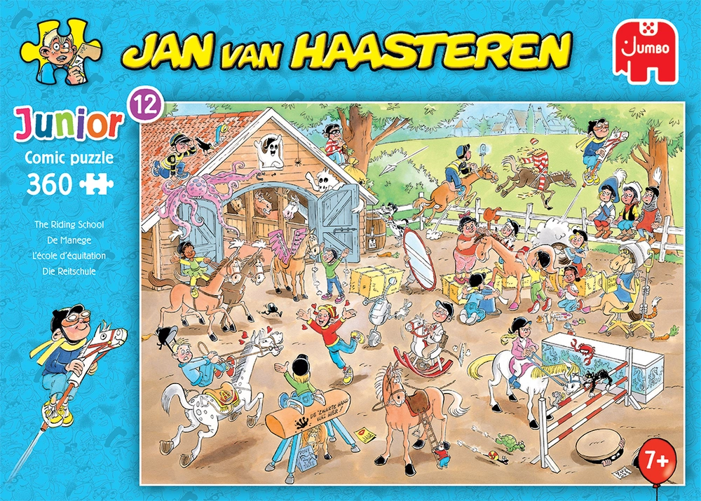 Jan van Haasteren Junior introducerer børn helt ned til 7 år til den absurde verden af disse berømte gåder. De tager deres første skridt ind i de humoristiske illustrationer af Jan van Haasteren og gør fremskridt med forskellige brikker og sværhedsgrader.
