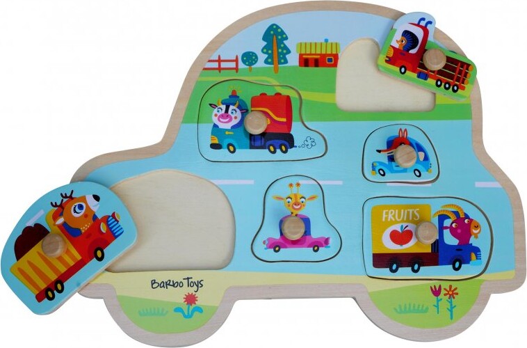 Fint knoppuslespil i trę fra Barbo Toys med 6 brikker med sųde, farverige dyr i forskellige transportmidler.  For de små fingre er det en stor hjęlp, at brikkerne har store knopper, så de er...