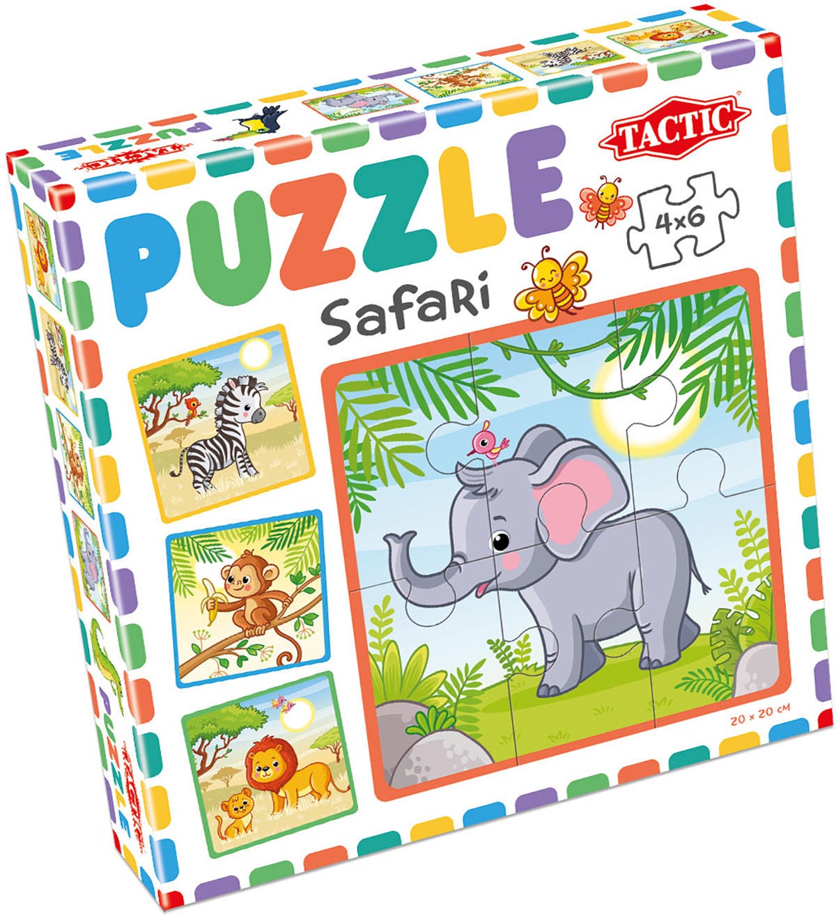 Puslespillet, Mit Første Puslespil fra Tactic, passer perfekt til de lidt yngre børn. Sættet indeholder fire forskellige puslespil med safarimotiver. Hvert puslespil består af seks store brikker med farverige motiver. Anbefalet alder: Fra 3 år.