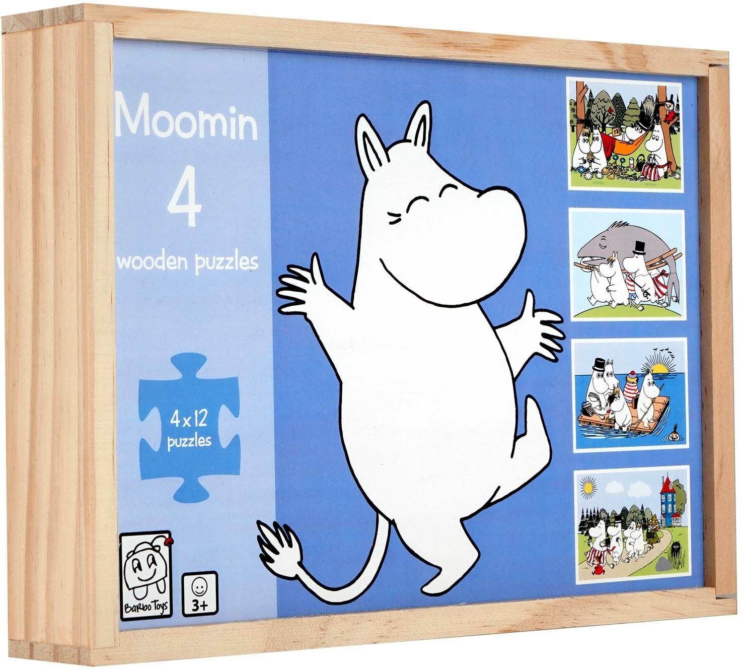 Fire trępuslespil fra Mumitroldene med en ęske i trę med et forskydeligt låg. De har tolv brikker hver og fire forskellige motiver fra Mumidalen. Perfekte til at ųve problemlųsning og finmotorik. CE-męrket. Indeholder 4 puslespil, der hver består af 12 brikker. Anbefalet alder: Fra 3 år.