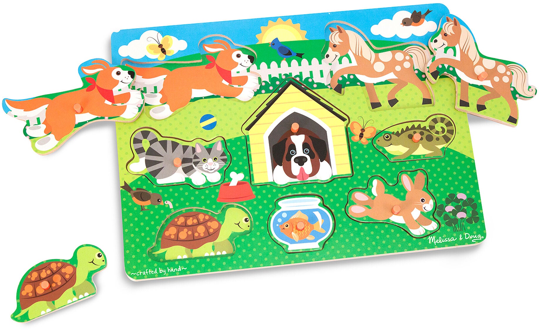 Knoppuslespil fra Melissa & Doug med et sødt kæledyrsmotiv. Perfekt til træning af dit barns koordination og finmotorik. - 8 brikker. - Lette for små hænder at gribe om. - Dyretema. - Perfekt til udvikling af finmotorikken. - CE-mærket. - Anbefalet alder: Fra 2 år. - Træ.