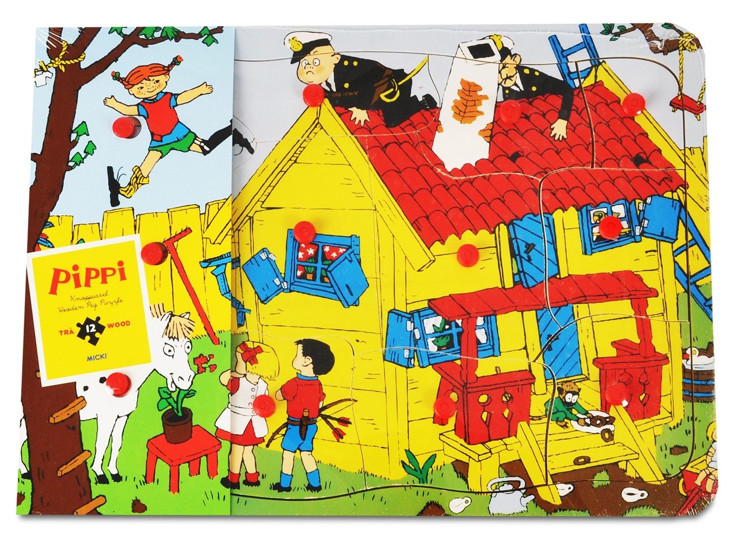 Farverigt træpuslespil med Pippi Langstrømpemotiv. Læg brikkerne en efter en, og se motivet vokse frem. Puslespilsbrikkerne har små knapper man kan holde i, og lægges i en ramme, hvilket hjælper dit barn i gang. Illustrationerne er lavet af Ingrid Vang Nyman. Anbefalet alder: Fra 18 måneder.
