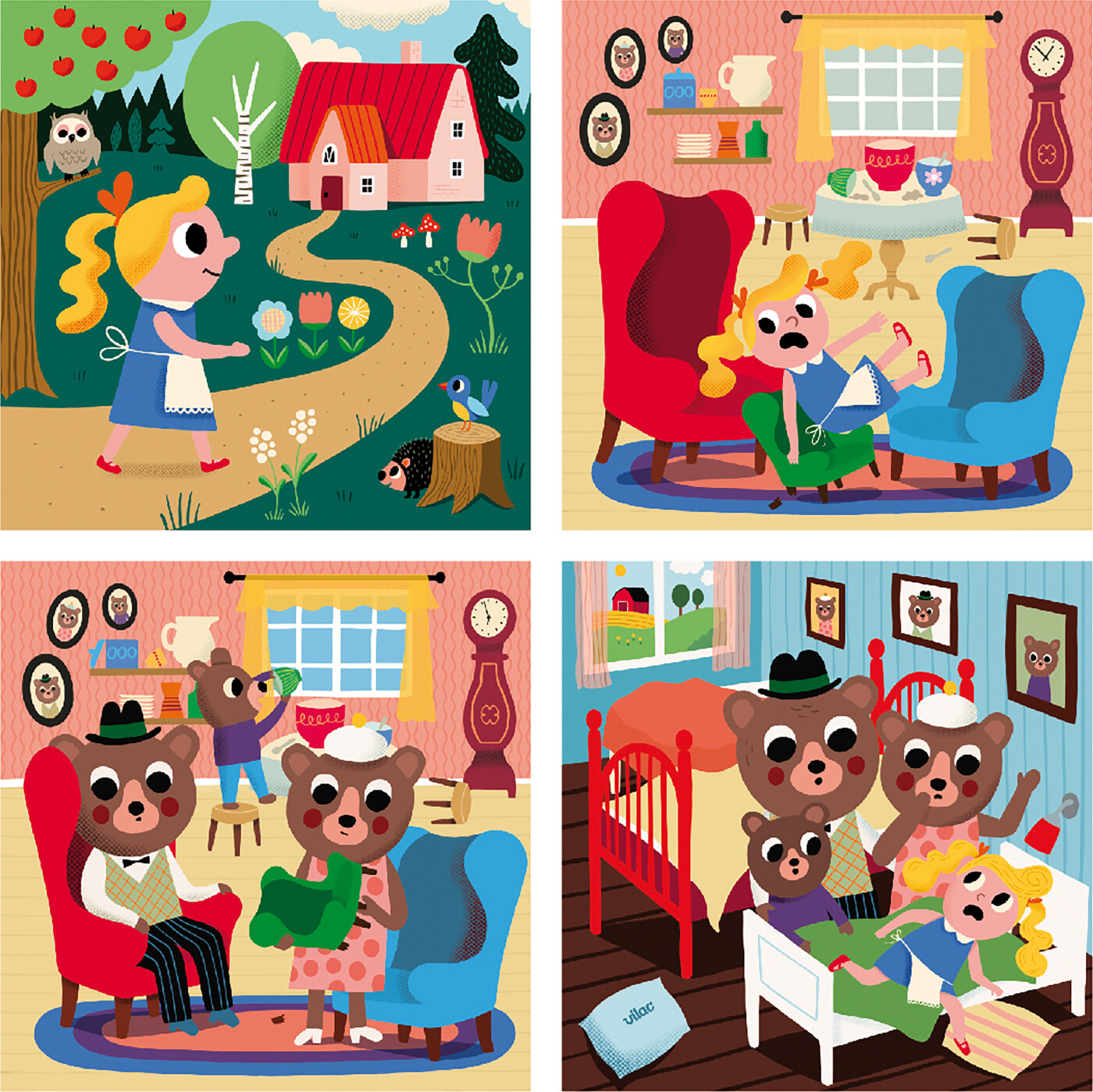 Fire puslespil af 9 brikker. Genoplev den magiske verden i den klassiske fortęlling om Guldlok, ved...
