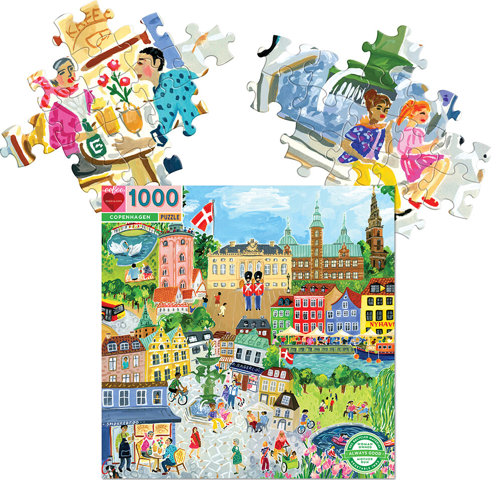 Helt unikt puslespil med 1000 brikker med fine håndtegnede illustrationer af København og byens...