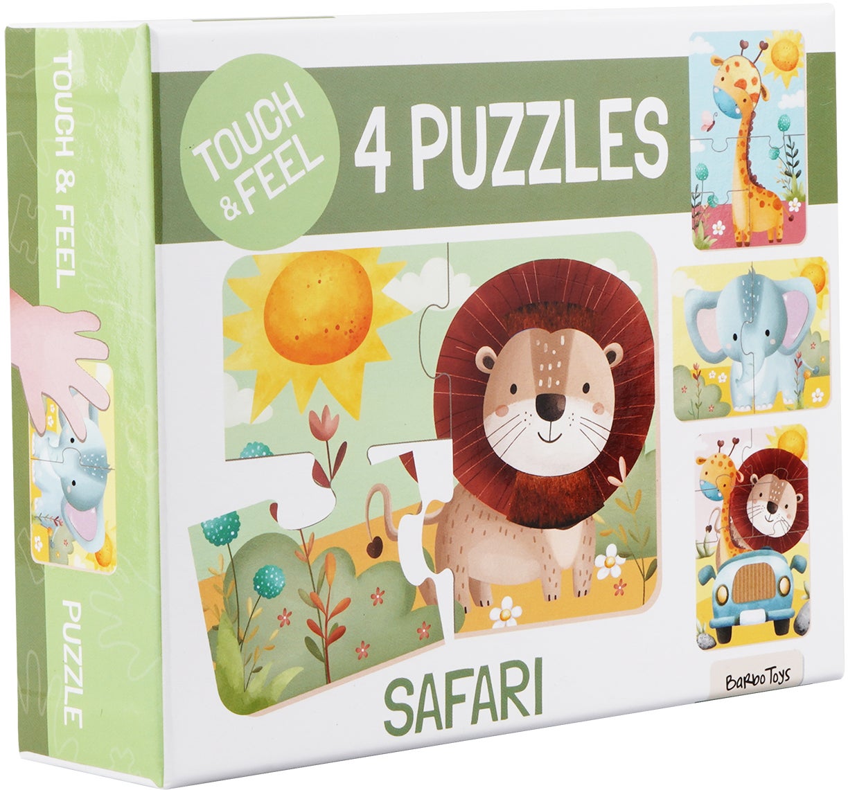 4-i-1 puslespil fra Barbo Toys med forskellige overflader at udforske. Perfekt til opmuntring af de sensoriske og finmotoriske færdigheder. - Safaritema. - Fremmer den sensoriske udvikling. - Udvikler kognitive og finmotoriske færdigheder. - Indeholder: 4 puslespil. - CE-mærket. - Anbefalet alder: Fra 1,5 år. - Karton, stof.