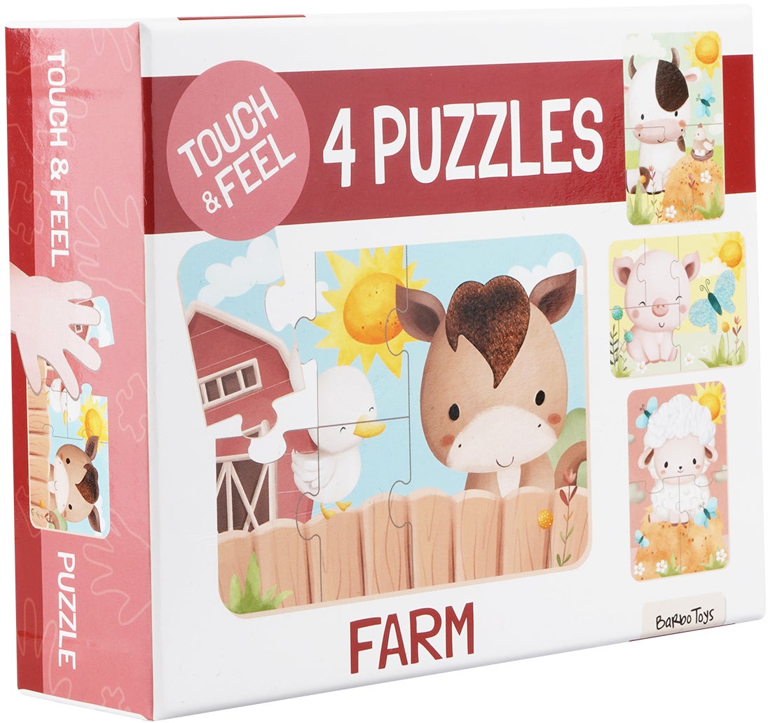 4-i-1 puslespil fra Barbo Toys med forskellige overflader at udforske. Perfekt til opmuntring af de sensoriske og finmotoriske færdigheder. - Bondegårdsdyr. - Fremmer den sensoriske udvikling. - Udvikler kognitive og finmotoriske færdigheder. - Indeholder: 4 puslespil. - CE-mærket. - Anbefalet alder: Fra 1,5 år. - Karton, stof.