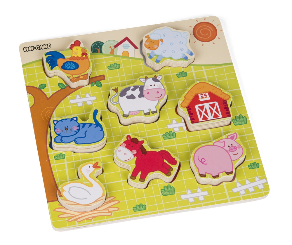 Trćpuslespil med tykke brikker 22,5x22,5 cm. Vćlg mellem version med bondegĺrdsdyr eller vilde dyr.