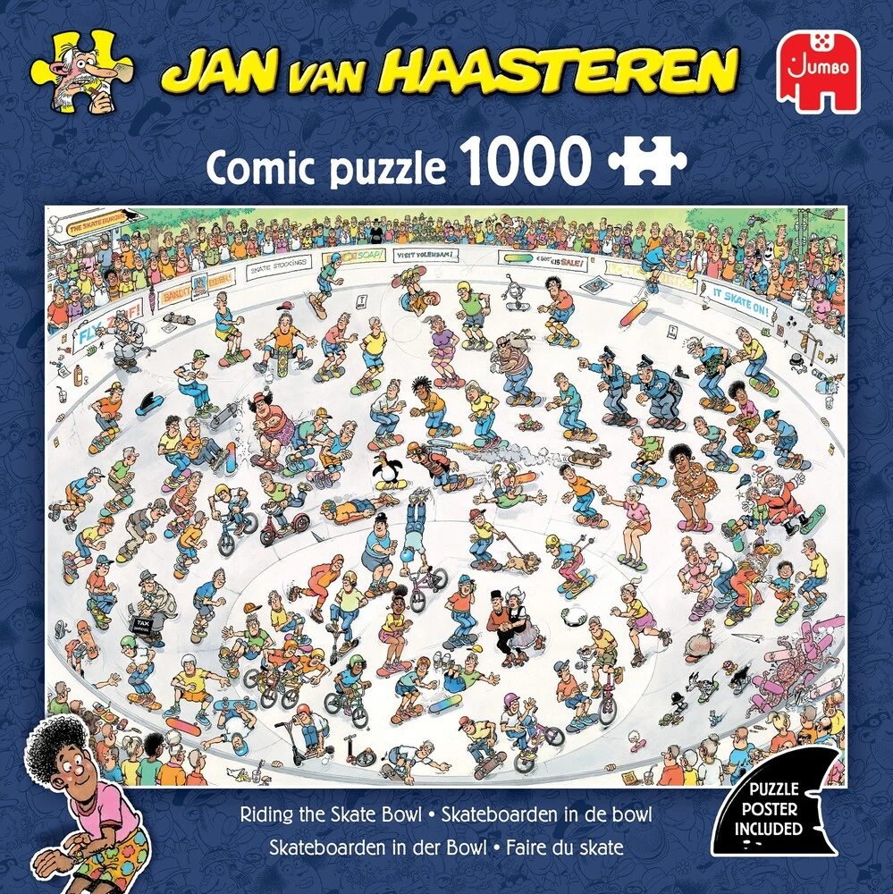 Hvilken handling i denne skatebowl! Alle fra Jan van Haasteren familien udfører tricks og manøvrer. Svigermor kører gennem bowl'en med høj hastighed, og Jan ser også ud til at have fundet sin plads i dette kaos af snowboardere, BMX-ryttere og andre a