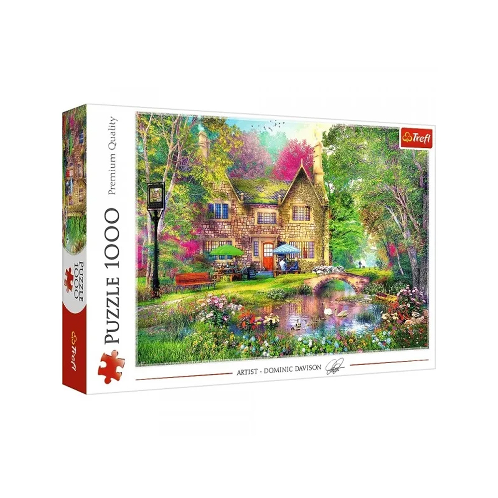 Forest Haven Et fredfyldt puslespil med idyllisk naturmotiv Tag en pause fra hverdagen og fordyb dig i dette stemningsfulde puslespil med 1000 brikker. Forest Haven inviterer dig ind i en fredelig skovlysning, hvor et hyggeligt stenhus og dækkede borde s