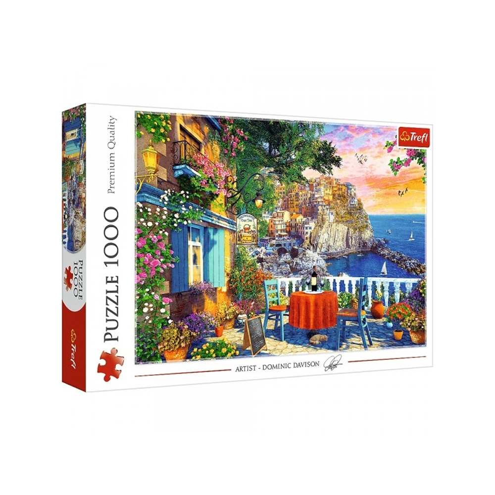 Cinque Terre View Et puslespil med udsigt til Middelhavets perle Træd ind i et malerisk øjeblik fra den italienske riviera med dette smukke puslespil på 1000 brikker. Cinque Terre View fanger stemningen fra en lille café med udsigt over farverige Manarol
