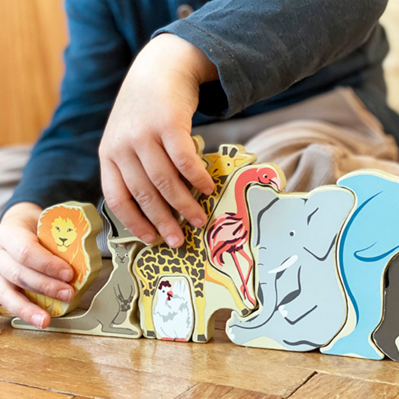 Anderledes puslespil, hvor dyrebrikkerne af trę kan stå oprejst og passe ind i hinanden.Dyrene kan også bruges til rolleleg og til stablelege, og hvad dit barn ellers finder på. Hvert dyr har et bogstav trykt på sig - det er dens forfogstav på engelsk. Og det er en hjęlp til at lęgge puslespillet, for dyrene ligger i nogenlunde alfabetisk rękkefųlge med deres forbogstav, når puslespillet er lagt.