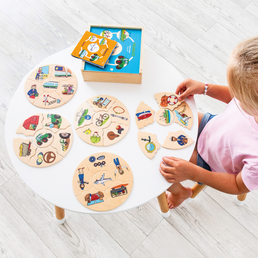 Disse puslespil lęrer dit barn eller en gruppe bųrn om de aktiviteter, mennesker, genstande og situationer, der knytter sig til 5 forskellige transportmidler. Fly, traktor, skib, cykel og tog.De er oplagte til sprogtręning.Kvaliteten er i top, og puslespillene bor i en ęske, så de er nemme at tage frem og pakke vęk. Fremstillet af solidt FSC-trę i institutionskvalitet.