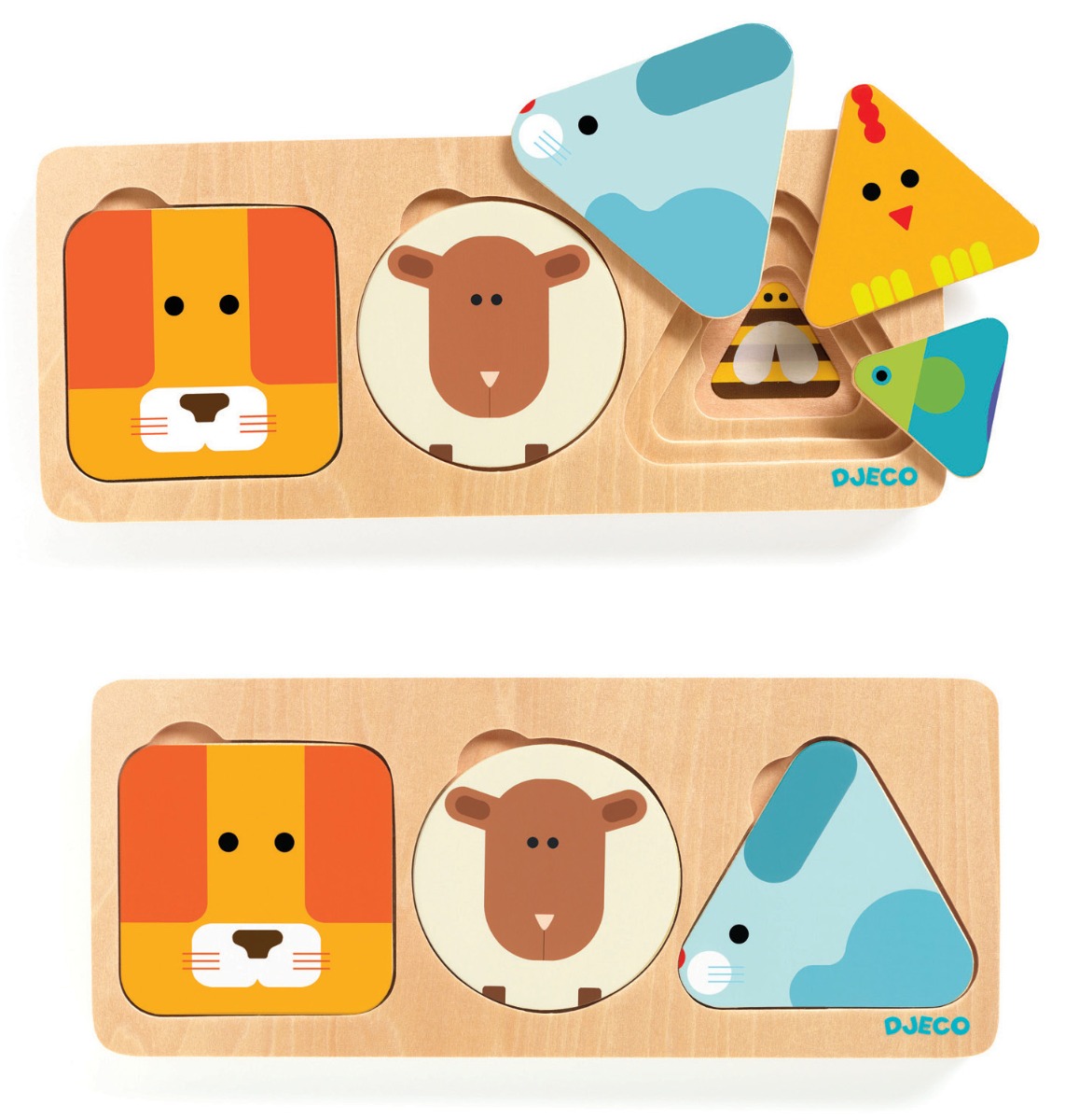 Dejligt, klassisk børnepuslespil til børn fra 18 mndr. I 3 lag, så der er i alt 9 brikker. Det søde babypuslespil med mange forskellige dyrebrikker er en godt udgangspunkt for at tale om dyr, og om det ene eller det andet skal ligge øverst, i midten, eller nederst.I kan også tale om de forskellige geometriske former, dyrene er.