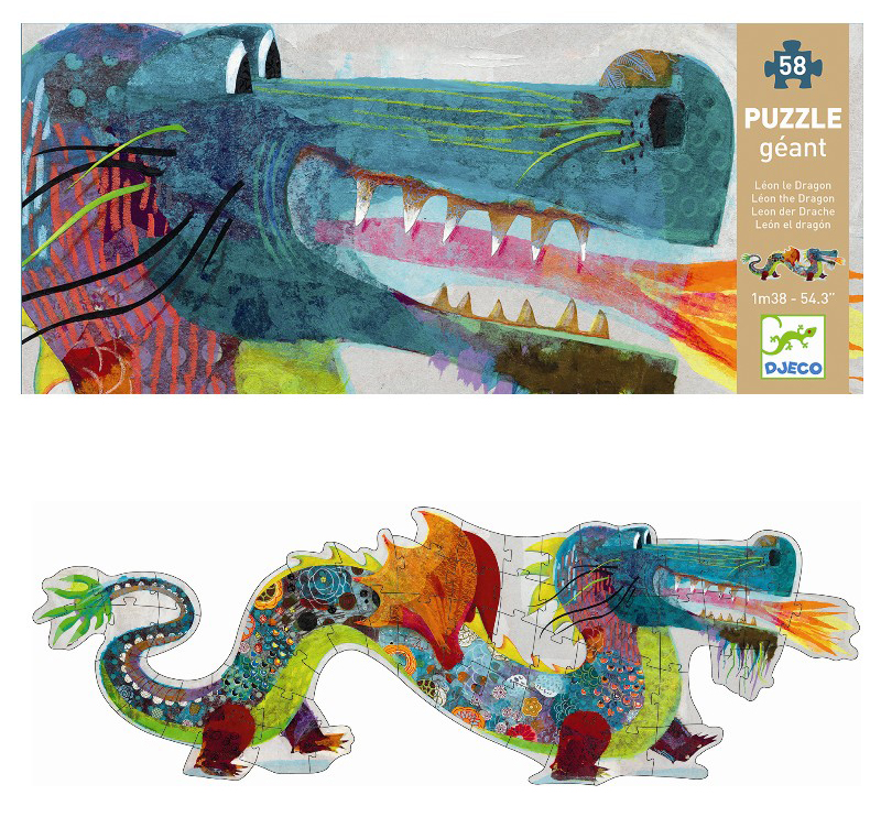 Et fantastisk fantasidyr lige midt på gulvet i stuen!Her har I dragen Leon i et herligt design med 59 kæmpe store brikker, der tilsammen får Leon til at måle 138 cm fra glohed næsetip til farlig halespids.Puslespil fra Djeco er af virkelig god kvalitet med tykke brikker, der ikke bliver flossede i kanten.