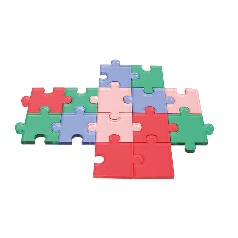 Puslespilsbrikkerne her nemme at sætte sammen - det sjove er især at de er gennemsigtige og oplagte at bruge sammen med et lysbord, hvor dit barn kan udforske farverne og hvordan de påvirker hinanden hvis I lægger brikkerne oven på hinanden.Af akryl-plast.