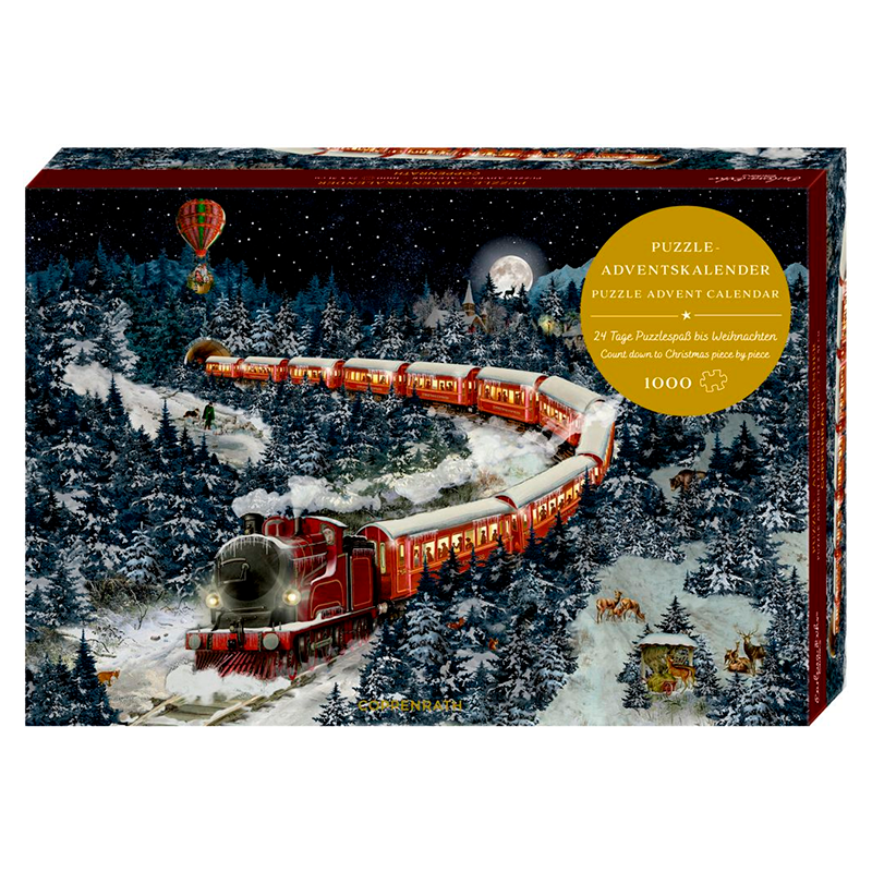 Puslespils-julekalender hvor du eller dit barn hver dag kan åbne en låge med cirka 42 brikker. Dag for dag kan I lægge puslespillet med det eventyrlige og lidt Harry Potter-agtige juletog, som i alt er på 1000 brikker. Hver låge har sin egen lille æske, så det er nemt at tage brikkerne op og lægge dagens del af puslespillet.Brikkerne er nummerede, så puslespillet kan pakkes væk igen i julekalenderen og måske bruges igen et andet år. Måske kan det blive en lille juletradition at finde puslespillet frem år efter år,