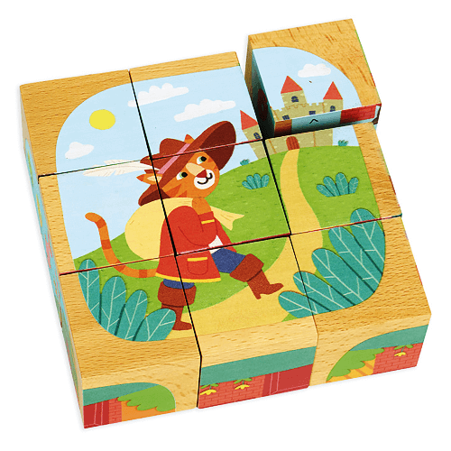 Den bestøvlede kat, Den lille Havfrue, Guldlok og de 3 bjørne og flere af de mest elskede eventyr finder du på træklodserne. Det er så hyggeligt, når I taler sammen om, hvad der er på motiverne - og måske digter lidt videre på det, I ser? Mål: Hver klods måler 4,5 x 4,5 x 4,5 cm Materiale: Den kendte Vilac-kvalitet i træ