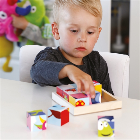 Dette søde træpuslespil udvikler mange kompetencer hos dit barn på måder, så det slet ikke føles som træning, men som hyggelig leg. Klodspuslespil er jo en klassiker, som du sikkert kender. Hver klods har 6 sider, som passer sammen med de andre klodsers sider, så de tilsammen danner 6 forskellige motiver, afhængigt af, hvilken side, der vender opad. Kassen bruges til at holde styr på klodserne, både når I lægger puslespillet, og når det står på hylden og venter længselsfuldt på at blive leget med. Motiverne på klodspuslespillet er de 6 kære figurer, som tilsammen udgør det svenske læringsunivers Babblarna. De hedder Babba, Bibbi, Bobbo, Dadda, Diddi og Georg. Nej, det passer ikke - den sidste hedder selvfølgelig Doddo. Nogle gange skal man overraskes lidt for at holde hjernen igang!Babblerne er en gang farveglade figurer, som er blevet udviklet for at gøre sprogtræning til et spændende eventyr fuld af leg.Sprogtræningen retter sig her mod børn i den tidlige sprogudvikling. Babblarna er udviklet således at alle kommer til at elske dem og hverken dit barn eller den voksne vil spekulere over at det faktisk er sprogudvikling det handler om i legen med og historierne om Babblarna.Babblarna taler deres eget sprog, som fuldstændig bygger på lyden i deres navn. Ved at lytte til måden de taler på og gentage og kopiere trænes dit barn i sin sprogudviklingen ud fra nogle principper, der er blevet udviklet på siden slutningen af 70'erne.Klodspuslespillet måler 14,5 x 14,5 cm. Passer til børn fra 3 år, men yngre børn har også super godt af at lege med Babblarba og træner deres mundmotorik og talegaver.