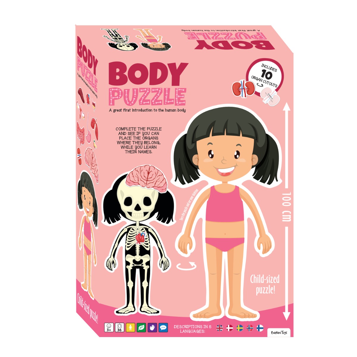 Sjovt gulv puslespil på 36 brikker, der stimulerer dit barns interesse for kroppen.Med dette gulv puslespil kan dit barn fra børnehavealderen og op blive udfordret på finmotorik og koncentration og samtidig øve sig i både at genkende kroppens former og formen på de kæmpe puslespilsbrikker. Bliver hele 100 cm lang, når puslespillet er lagt. Men vent: Der er jo billede på begge sidder af alle brikkerne! Ja med dette gulv puslespil får I to puslespil på én gang. Den ene side viser barnet. Den anden side viser skelettet. Det giver lidt ekstra sjov udfordring, når puslespilsbrikkerne skal vende med den rigtige side opad. Dansk kvalitetDet dobbeltsidede puslespil er produceret af danske Barbo Toys, der ligger i Vedbæk. Deres legetøj er skabt med øje for bæredygtighed og kvalitet, så puslespillet uden problemer kan klare gulvets nullermænd.